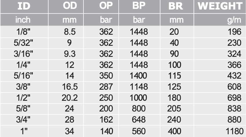 Yüksek basınç gerektiren solvent, boya vb. Solvent, boya, izosiyanat içeren sistemlerde, poliole dayanıklı poliamid alt tabaka ve poliüretan süt tabakası, aramid tekstil takviyeli, çok düşük sıcaklık koşullarına uygun.